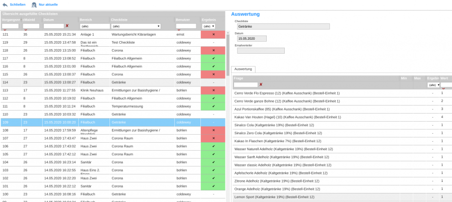 Eine ausgefüllte Checkliste kann, je nachdem wie die Checkliste beantwortet wurde, positiv oder negative Ergebnisse erzeugen. Um diese Ergebnisse nachzuvollziehen können in dieser Oberfläche alle jemals ausgefüllten Listen aufgelistet werden. Über den Knopf „Alle“ können alle Auswertungen angezeigt werden, der Knopf „Nur aktuelle“ wechselt auf die aktuellen Listen.