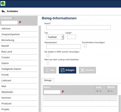 Hier können Informationen zu Belegen angelegt, gelöscht und bearbeitet werden. Angelegt werden hier ALLE möglichen Beleginformationen, die für irgendeinen Belegtypen nötig oder wichtig sein könnten. Eine Zuweisung dieser Beleginformationen zu den einzelnen Belegtypen kann wahlweise über den Menüpunkt „Beleginformationen“ oder auch den Menüpunkt „Belegtypen“ erfolgen. Bei der Zuweisung von Beleginformationen zu Belegtypen hat man die Auswahl die Information verpflichtend oder nur optional abzufragen.