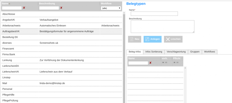 Die linksstehende Tabelle listet alle Belegtypen auf, die bisher angelegt worden sind. Dabei kann nach dem Namen, der Beschreibung und dem zugeordneten Workflow gefiltert werden. Das rechtsstehende Menü bietet die Möglichkeit, neue Belegtypen zu erstellen. Es ist ein Name für den Belegtypen erforderlich, außerdem kann eine Beschreibung vergeben werden.