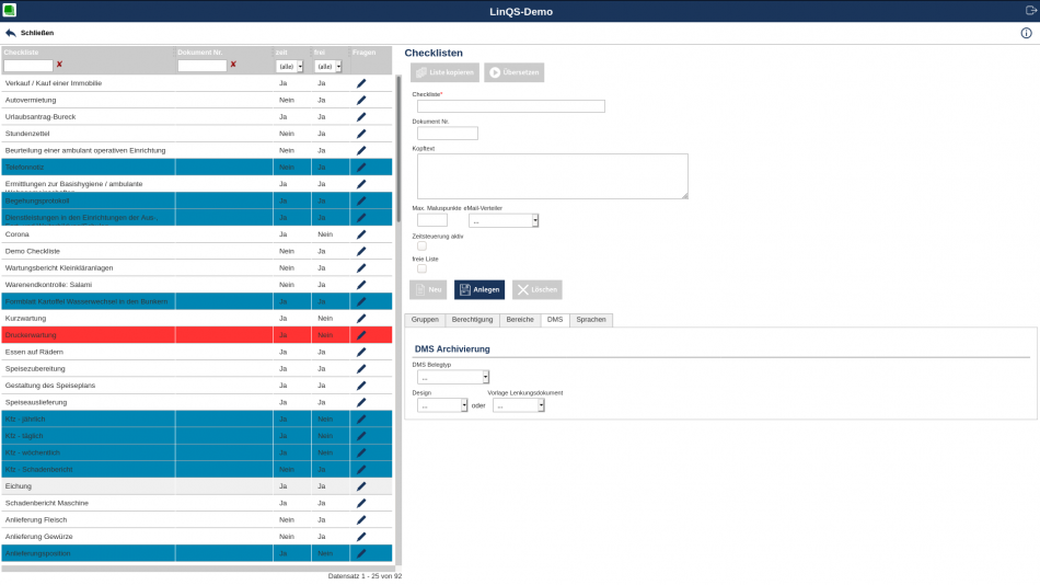 Die Checklisten anzulegen ist das Herzstück unserer Software. In dieser Oberfläche werden Checklisten angelegt, Berechtigungen erteilt, Checklisten zeitgesteuert und Bereichen zugewiesen.