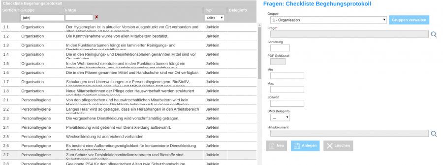 Diese Oberfläche dient dazu, die einzelnen Checklisten mit Fragen zu befüllen. Die Fragen müssen dafür vorab angelegt worden sein, ebenfalls muss auch die Checkliste vorab angelegt worden sein.