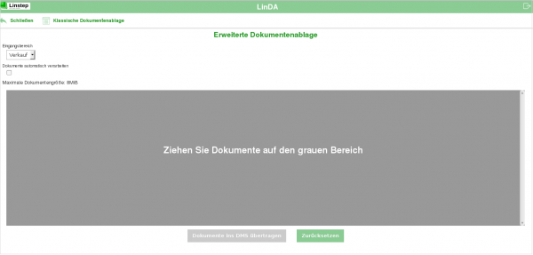Um neue Dokumente in Linda einzufügen, können diese per Upload auf den Server geladen werden.