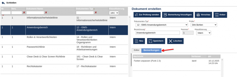 Die Funktion „Bemerkung“ dient dazu, Hinweise zwischen Prüfern und Erstellern auszutauschen, zusätzliche Informationen zum Dokument festzuhalten oder interne Notizen zu hinterlegen.