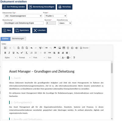 Die Kombination aus leistungsfähigem Editor und separatem Bemerkungsbereich ermöglicht eine strukturierte Erstellung, Bearbeitung und Nachvollziehbarkeit von Dokumenten über den gesamten Lebenszyklus hinweg.