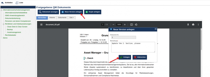 Nach der Bestätigung wird die neue Version automatisch angelegt und ist anschließend im Bereich Erstellen für die Dokumentersteller sichtbar. Dort kann die neue Version weiterbearbeitet und erneut durch den Prüf- und Freigabeprozess geführt werden.