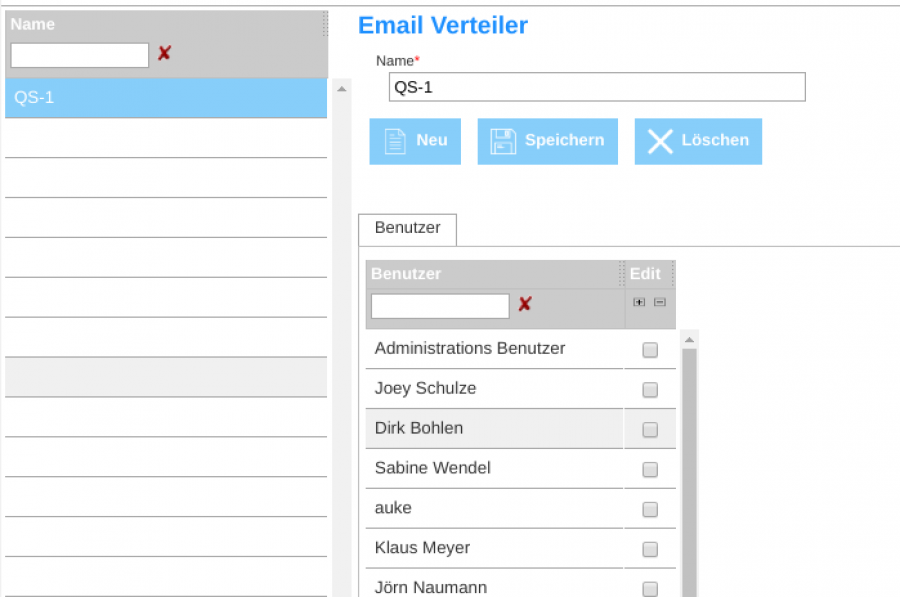 Die linksstehende Tabelle zeigt dabei alle bisher angelegten Verteiler, die rechtsstehende Tabelle zeigt, nachdem auf einen Verteiler geklickt wurde, welche Benutzer in diesem Verteiler enthalten sind.