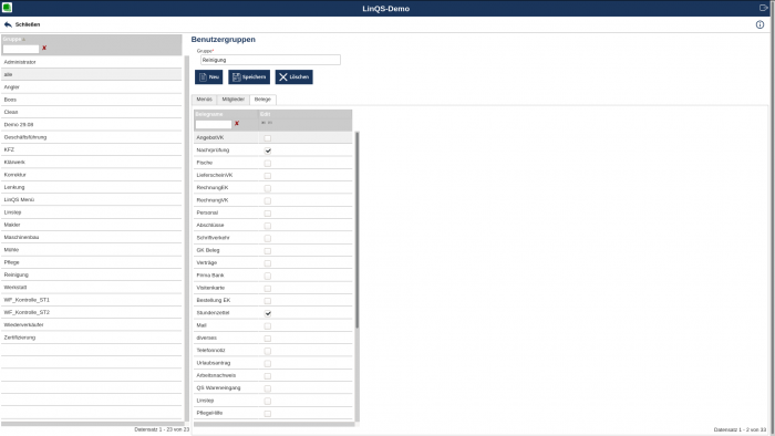 Über den Reiter Menü können Sie per Setzen eines Häkchens der gerade erstellten Benutzergruppe oder bereits bestehenden Benutzergruppen bestimmte Menüpunkte zuweisen, beispielsweise, ob jemand die Berechtigung hat, Belege zu archivieren oder er diese nur einsehen darf etc. Die Menüpunkte, für die keine Berechtigung bestehen, werden der jeweiligen Benutzergruppe dann gar nicht angezeigt, deren Menü verkleinert sich also.
